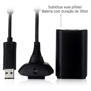 Conjunto composto por bateria recarregável com cabo e carregador para controle de videogame 360 na cor preta, garantindo autonomia prolongada e carregamento prático sem interrupções durante o jogo.