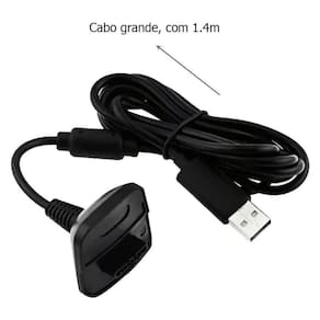 Especificações Técnicas Compatibilidade com controles do modelo 360; capacidade da bateria de 1 200 mAh; tensão de saída de 5 V; corrente de saída do carregador de 500 mA; comprimento do cabo de 1,2 m; conexão USB plug and play; acabamento preto resistente.