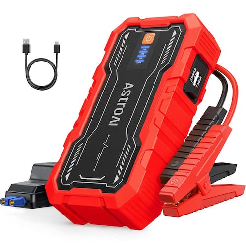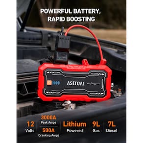 Acelerador de partida com bateria de carro AstroAI S8 Pro, bateria Peak Jump Starter de 3000 A para motores a gasolina de até 9,0 L e diesel de 7,0 L, caixa de salto portátil de 12 V com lanterna e cabos de ligação de 3 modos, vermelha