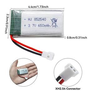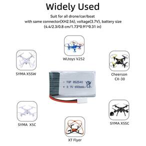 Bateria de drone Lipo adequada para syma X serial XH2.54 conector UVA quadricóptero dron-SYMA, X5C, X5SW, X5SC, WLtoys V252, XT flyer, Cheerson CX-30 (observe o tamanho da bateria e conecte) - ??Bateria Lipo Drone?Adequado para drone quadricóptero UVA syma X serial XH2.54 – SYMA, X5C, X5SW, X5SC, WLtoys V252, XT flyer, Cheerson CX-30 (observe o tamanho da bateria e conecte) - ? ?Bateria recarregável de 3,7 V? Você pode carregar a bateria em casa e também ao ar livre, use todos os bancos de energia, energia do carro, computador para carregar - ??Especificações da bateria?Conector XH2.54, bateria de substituição de drone de 3,7 V 650 mAh, tamanho para 4,4 x 0,9 x 2,5 cm, peso para 17,6 g cada bateria - ??Lista de pacotes?Você receberá 2 baterias lipo de drone de 3,7 V 650 mAh, 2 cabos - ??Antes do seu pedido?Alguns drones não são adequados para a nossa bateria. Verifique se o seu drone se ajusta à bateria (tensão, tamanho, plugue, interface (XH2.54) é adequado)