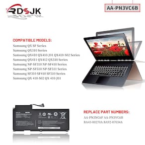 - Modelos compatíveis: para a série Samsung QX SF; para Samsung QX310, QX410, QX410-J01, QX410-S02, QX411, QX412, QX510; para Samsung NP-SF310, NP-SF410, Série NP-SF510; Para Samsung SF310, SF410, SF510; Para Samsung QX 410-S02, QX 410-J01 - Substitua os números de peça: AA-PN3NC6F AA-PN3VC6B BA43-00270A BA92-07034A - 100% novo do fabricante. Até 500 ciclos de recarga durante a vida útil da bateria. O tempo real de operação dependerá da quantidade de eletricidade necessária para o dispositivo e de como você o usa