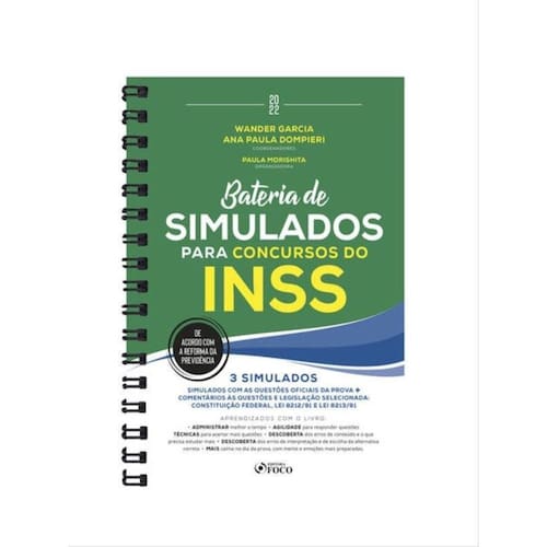 Sobre a obra Bateria de Simulados para Concursos do INSS - 1ª ED - 2022 Quer passar no INSS? Então faça simulados antes da prova! Você terá os seguintes ganhos ao fazer os simulados desse livro: • aprenderá a administrar melhor o tempo; • aprenderá como ser mais ágil para responder questões; • aprenderá técnicas para acertar mais questões a cada prova; • descobrirá onde estão os seus erros e o que precisa estudar mais; • descobrirá onde estão os seus erros de interpretação e de escolha da alternativa correta; • ficará mais calmo para o dia da prova, pois terá simulado diversas vezes esse momento e suas mente e emoções estarão mais preparadas. Mas não basta fazer simulados. É preciso fazer com o material correto. Existem técnicas para treinar via simulados e esse livro tem tudo o que você precisa para fazer isso da melhor maneira. Confira os principais pontos para estudar por meio de simulados: 1º) Você precisa usar como simulado as questões reais e completas de provas anteriores do INSS. E isso é o que fazemos neste livro. 2º) Você precisa resolver as questões como se você estivesse na prova. Neste livro as questões vêm dispostas como na prova, e depois você tem uma folha de respostas para fazer o mesmo que faria nesta. Sem contar que os comentários às questões e os gabaritos não ficam na mesma página do simulado, então você só tem a sua mente mesmo para resolver as questões, como se estivesse na hora da prova. 3º) Você precisa ter um feedback de cada questão, para saber onde e porque cometeu cada erro. Este livro também oferece isso, pois cada questão é respondida e comentada, alternativa por alternativa, para você entender o que precisa estudar mais e que erros você tem cometido ao interpretar questões e escolher a alternativa correta. 4º) Você precisa saber como está o controle do tempo e a evolução dos seus resultados. Neste ponto disponibilizamos ao final do livro uma sessão só para você preencher a sua pontuação em cada prova, o tempo gasto na prova, os itens que você precisa melhorar e outros pontos importantes para você evoluir seus resultados a cada novo simulado. 5º) Você precisa fazer um número mínimo de simulados. Quanto mais simulados, melhor. Eles devem ser feitos ao final de cada semana de estudos. Se não for possível, tente fazer ao menos 1 simulado a cada 10 dias ou a cada 2 semanas. Outro ponto importante é que o livro está atualizadíssimo e informa para você como fica a resposta de cada questão, se porventura alguma questão sofrer alteração no gabarito por alguma novidade legislativa ou jurisprudencial. Agora é com você: crie seu cronograma de simulados e cumpra-o com seriedade, simulando para valer o momento da prova. Bom trabalho e ótimos estudos!
