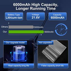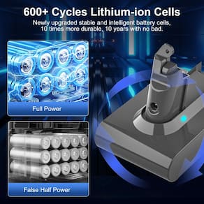 Especificação: Tensão: 21,6 V Capacidade: 6000mAh Tipo de bateria: Bateria de íon de lítio recarregável Tempo de funcionamento 30% maior do que outras baterias, 100% compatível com carregador autêntico e estação de ancoragem. Compatível com o modelo da série V6 Compatível com V6 Absolute, V6 Animal, V6 Motorhead, V6 Slim Compatível com V6 DC58 DC59 DC61 DC62 DC72 DC74 Compatível com aspirador SV03 SV04 SV05 SV06 SV07 SV09, 595 650 770 880 Compatível com V6 Car+ Boat, V6 Top Dog, V6 Colchão, V6 Trigger, V6 Trigger Pro Excl, V6 Multifloor Exclusive, V6 Top Dog HEPA, V6 Trigger Extra, V6 Baby+ Child Vacuum - Capacidade atualizada de 6000 mAh: Tipo de bateria: íons de lítio | Tensão: 21,6 V | Capacidade: 6000 mAh. Observação: as baterias novas devem ser totalmente carregadas antes do uso e podem ser totalmente ativadas e alcançar o desempenho ideal após 2-3 usos regulares (carga/descarga completa). - Perfeitamente compatível: Nossa bateria V6 é perfeitamente V6 DC58 DC59 DC61 DC62 DC72 DC74 Absolute Animal Motorhead Slim SV03 SV04 SV05 SV06 SV07 SV09 595 650 770 880 Aspirador portátil e funciona para bateria V6 autêntico carregador. - Segurança e estabilidade: bateria de íon de lítio de grau A+ sem efeito de memória e chip inteligente oferece proteção abrangente: proteção contra sobrecarga, sobredescarga, sobrecorrente e sobretensão para garantir a segurança e prolongar a vida útil da bateria. - Fácil de instalar: mesmo tamanho e design da bateria autêntico. Fácil instalação, adequada para carregador autêntico. Perfeitamente compatível com aspirador V6 e outros modelos de aspirador V6. Esta bateria de substituição para V6 também tem um indicador LED para mostrar a energia restante. Não precisa se preocupar com quedas de energia. - Excelente suporte ao cliente: fornecemos serviço de garantia. Se você tiver algum problema com sua bateria de substituição para V6, não hesite em entrar em contato conosco, oferecemos um excelente serviço pós-venda para você.