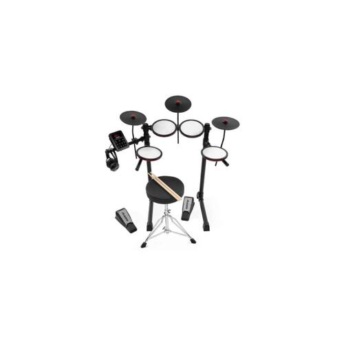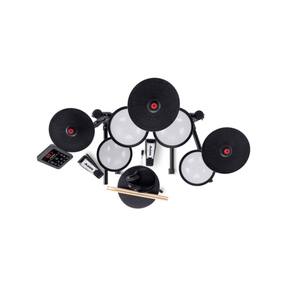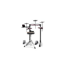 - 4x pads de 8? com peles mesh - 3x pads de prato de 8? - Pedais de bumbo e hi-hat tamanho padrão (switch) - Rack com ajuste total de altura - Banco, fones de ouvido e um par de baquetas - Módulo com 12 kits, 110 timbres e 20 sons - Bluetooth, AUX, USB MIDI, line out - Tempo control, metrônomo, funções de gravação/play - Polifonia máxima: 32 - Kits:12 - Timbres: 110 - Metrônomo: 30-250 bpm - Display: LCD retro iluminado - Conector input DB25-pin para cabo snake - Saída estéreo de fones de ouvido ?” (3.5 mm) - AUX estéreo ?” (3.5 mm) - TRS out ¼” (6.35 mm) - Porta USB-B - Alimentação: 9V DC, 500mA: centro positivo - Dimensões: 1.100,33 mm x 1.039,37 mm x 640,08 mm - Peso: 10,2kg