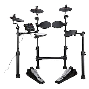 Composição do kit 1 módulo csd100 vermelho fotos ilustrativas 1 pad de caixa single zone com 7 2 pads de tons com 7 1 pad de surdo com 7 2 pads de prato com ride dual zone ambos com 8 1 pad de chimbal com 8 1 pedal controlador para bumbo 1 pedal controlador para chimbal 1 fonte de energia bivolt 9 dc 1 kit de cabo padrão Pronta pra montar e tocar, acompanha baquetas Não inclui banco ou demais acessórios