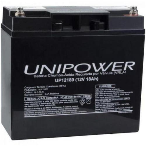 Suas aplicações incluem equipamentos médicos e nobreaks. Voltagem:12V Amperagem:18Ah Dimensões:181x77x167x167mm (CxLxAxAT) Pesquisa:bateria|selada|12v|18a|up12180|up-12180|up 12180