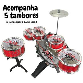 Itens inclusos: 1 Bumbo, 5 Tambor, 1 Prato, 2 Baquetas, 1 Banco