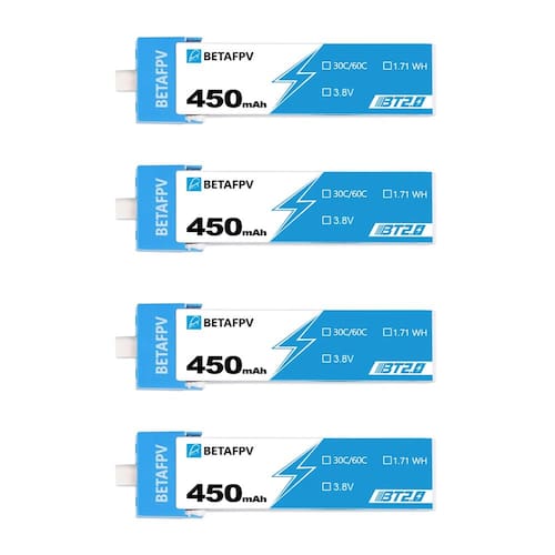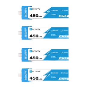 BETAFPV 4 peças BT2.0 450mAh 1S Bateria 3,8V 30C Lipo Bateria com conector BT2.0 compatível com 1S FPV Tiny Whoop Drone Quadricóptero como Meteor75, Cetus Pro FPV Kit, Cetus X FPV Kit Especificação: Item: bateria 1S Capacidade: 450mAh Temperatura: 30°C / 60°C Tensão: 3,8 V Dimensões: 62 x 15,5 x 6,7 mm Conexão: Conexão BT2.0 Peso: 12,7 g/pc Atenção: Não sobrecarregue as pilhas nem descarregue muito. Não o coloque próximo ao estado de alta temperatura. Não jogue no fogo. Não jogue na água. Conteúdo da embalagem: 4 baterias BT2.0 450 mAh 1S 30C - Compatível: A bateria BT2.0 450mAh 1S é adequada para a maioria dos drones sem escovas 1s no mercado. Pode fornecer energia estável e consistente, o que alcançou equilíbrio dinâmico e maior tempo de voo. Basta modificar o conector PH2.0 para o conector BT2.0 - Conector BT2.0: A bateria BT2.0 450mAh 1S vem com conector BT2.0 que é mais durável e pode descarregar mais correntes na mesma capacidade, fornecendo mais energia - Eficiência: A bateria BT2.0 450mAh 1S 30C tem saída de corrente/tensão estável e alta eficiência - Descarga: A descarga do lipo 450mAh 1S BT2.0 torna-se mais eficiente ao resolver o problema de queda de tensão. Os pilotos podem desfrutar de mais tempo de voo sem perturbação de aviso de baixa tensão - Observação: Não carregue uma célula com danos físicos ou inchada. Não sobrecarregue ou descarregue demais as baterias. Não o coloque ao lado da condição de alta temperatura ou de um ambiente úmido