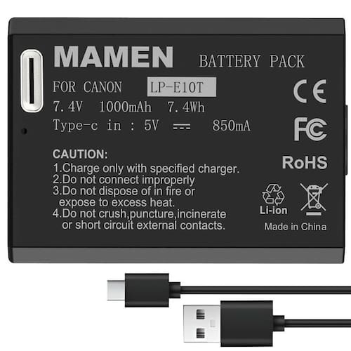 Alimente sua câmera canon eos com praticidade e segurança usando a bateria mamen lp-e10 usb-c, compatível com todos os modelos que utilizam bateria canon lp-e10. Totalmente decodificada, ela garante desempenho confiável e funcionamento perfeito, sem mensagens de erro em sua câmera canon eos.Este bateria mamen lp-e10 usb-c para câmeras canon possui capacidade de 1000mah 7.4wh e saída de 7.4v, esta bateria oferece energia estável para longas sessões de foto e vídeo. Seu grande diferencial é a entrada usb-c integrada, que permite carregamento rápido e conveniente diretamente via carregadores de parede, veiculares ou power banks com entrada usb-a. Se preferir, você também pode carregá-la em carregadores canon lp-e10 externos ou de qualquer marca.Além da versatilidade, a bateria lp-e10 mamen usb-c conta com conectores banhados a ouro para maior durabilidade e sistema de proteção inteligente contra sobrecarga, superaquecimento e curto-circuito - garantindo mais segurança para o seu equipamento canon.Principais características: Acompanha cabo usb-a para usb-c Conectores precisos e banhados a ouro para bateria canon lp-e10 Totalmente decodificada e pronta para uso Para câmeras canon eos rebel selecionadas Capacidade 1000mah 7.4wh e saída de 7.4v Carregamento via usb-c ou carregador externo lp-e10 Proteção contra sobrecarga, superaquecimento e curto-circuito Pode ser carregada em qualquer fonte usb carregador padrão, veicular ou power bank câmeras canon eos rebel compatíveis: t5, t6, t7, t7+ e t100, entre outras câmeras canon que utilizam bateria canon lp-e10.