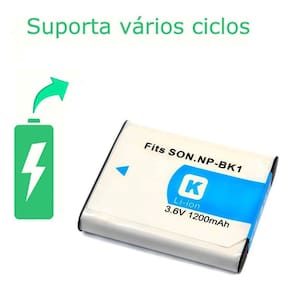 Bateria np-bk1/fk1 1200mah 3.6v para sony cybershot dsc-s750 Conteúdo da embalagem: 1 bateria Especificações: capacidade: 1200 mah tipo: li-ion voltagem: 3.6v número do modelo: np-bk1 peso: 30g Benefícios: 1200 mah alto desempenho mais de 300 ciclos Características: bateria recarregável de ótima qualidade, fabricada com as melhores células disponíveis no mercado, aumentando o tempo de vida útil. não apresenta efeito memória, o que permite recarregar a bateria parcialmente esgotada sem comprometer a performance. sistemas internos de proteção contra excesso de voltagem, excesso de corrente e sobrecarga protegem a bateria de alguma eventual Condição inadequada de uso.