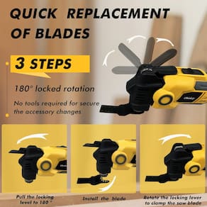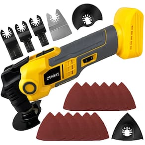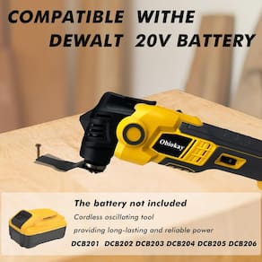 Kit de ferramentas oscilantes de troca rápida de lâmina antivibração sem fio com lâminas, 6 velocidades, ângulo de oscilação de 4° multiferramenta para corte/moagem/lixamento (bateria não incluída) - Compatível com baterias De-walt: multiferramenta oscilante sem fio Obiokay tem motor sem escovas de alta eficiência e é totalmente compatível com baterias Dewalt, incluindo DCB206 DCB205 DCB204 DCB181 DCB182 DCB200 DCB203 DCB205-2 DCB204-2 DCB204-2 DCB204-2 DCB2 CB206-2. O kit de ferramentas oscilantes sem fio não inclui bateria - Ângulo oscilante de 4° e antivibração: a ferramenta oscilante de ângulo oscilante de 4° tem 6 velocidades variáveis entre 8000-22000 OPM, a eficiência de corte será maior. Em comparação com ferramentas oscilantes de ângulo de 3°, a eficiência de trabalho será maior. E a função antivibração torna o corte mais estável e a operação mais fácil - Troca rápida e luz LED: economiza tempo e esforço, a operação de troca rápida permite que as lâminas e acessórios sejam trocados rapidamente sem chaves. As luzes LED fornecem melhor visibilidade, especialmente em áreas mal iluminadas ou difíceis de alcançar - Lâminas multifuncionais: adaptador de acessório universal para uso com a maioria das marcas de acessórios de ferramentas oscilantes. Kit de várias lâminas oscilantes para serrar, raspar, cortar, lixar e moer materiais - Conjunto de ferramentas de oscilação: 1 ferramenta elétrica oscilante Obiokay , 1 almofada de lixa, 12 papel de areia, 12 cabeças escareadas de aço HCS, 1 lâmina de serra HCS, 2 lâminas de serra de madeira, 1 raspador de aço inoxidável (somente ferramenta)