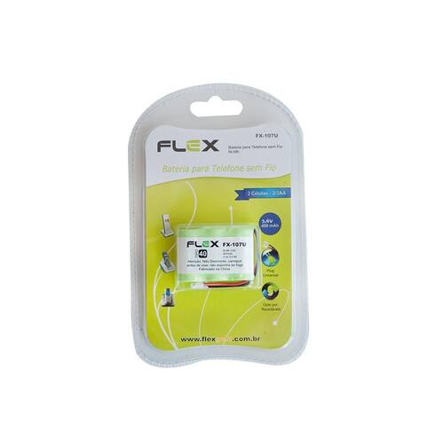 Bateria Para Telefone Sem Fio 3.6 v 400m Ah Fx-107 U - Flex Bateria para telefone sem fio Tipo 40 Ni-Cd 3.6V 400mAh 3 células 2/3 AA PLUG UNIVERSAL Baterias de telefone sem fio com PLUG UNIVERSAL, podem ser utilizadas em qualquer aparelho que tenha por padrão baterias com as mesmas características técnicas como voltagem, amperagem e tamanho da bateria, não é necessário se preocupar com o formato do conector. Ficha técnica - Voltagem da bateria: 3.6V - Capacidade da bateria: 400mah Homologação Anatel: 052051802149 Ean: 5415329877625