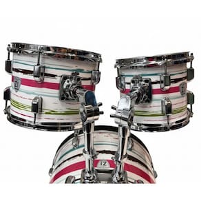 A configuração da Zowag Z1 White Funny inclui bumbo de 16", tons de 10" e 12", surdo de 13" e caixa de 12".
