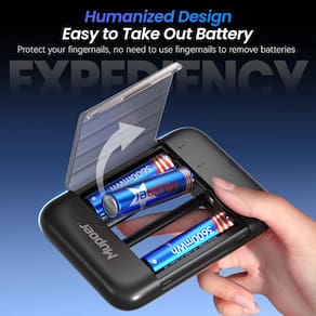 - 2500 Cycle Life 0V Ativação: Recarga As baterias aa aceitáveis podem ser carregadas até 2500 vezes, sem efeito de memória e baixa taxa de descarga, economizando muito dinheiro. Mesmo que a bateria esteja sem carga e a voltagem seja de 0V, o carregador pode ativar diretamente a bateria de atualização para carregar