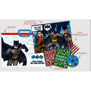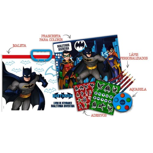 -Preparados para uma aventura incrível com a "Batman Maleta Divertida"? Nesta maleta cheia de surpresas, vocês vão encontrar 6 lápis grandes para desenhar e colorir, aquarela para criar pinturas épicas e adesivos do Batman e seus amigos! É a sua chance de se tornar um verdadeiro herói e dar vida às suas histórias favoritas! Vamos juntos enfrentar os vilões e colorir a cidade de Gotham!