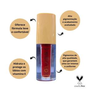 O Batom Líquido Velvety Glass oferece fórmula leve e confortável, com acabamento aveludado. Hidrata e protege os lábios, pigmentos de alta qualidade, que garantem uma cor intensa e uniforme. Formulado com vitamina E.