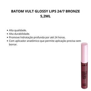 Gloss labial. vult glossy lips promove hidratação profunda para os seus lábios por 24 horas, 7 dias por semana, além de colorir e deixá-los com aparência saudável, livre do ressecamento. O glossy lips Vult alia beleza com cuidado entregando vários benefícios, como lábios hidratados, com cor natural e textura leve. O produto é rico em Ácido Hialurônico e também conta com um blend de vitaminas e óleos especiais que revitalizam os lábios e promovem hidratação profunda. Além disso, possui um toque macio e confortável, que não fica pegajoso e não escorre.