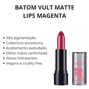 Batom Vult Matte Lips com acabamento matte aveludado. Sua textura confortável tem alta pigmentação e alta cobertura duradoura.O Batom Vult Matte Lips apresenta fórmula enriquecida com Vitamina E, Pantenol e Óleo de Rícino, ativos hidratantes que deixam o efeito matte confortável nos lábios. Sua composição apresenta Tecnologia Real Color: alta pigmentação e cores fiéis da embalagem à sua pele, além, é claro, de ser vegano e cruelty free.