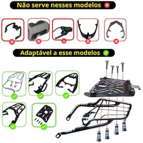 O produto acompanha uma placa de base universal. No entanto, é obrigatório que a sua motocicleta já possua um suporte de bagageiro (churrasqueira) instalado (não incluso). Além disso, o bagageiro de fábrica geralmente não serve.
