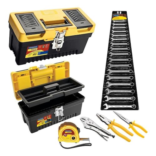 Caixa de Ferramentas Plastica + Jogo de Chaves Combinadas 6 a 22mm, Trena e Alicates