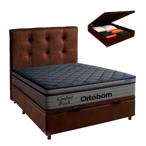 Baú Marrom + Cabeceira + Colchão Casal Confort Black Ortobom Conjunto Casal Colchão Confort Black + Cama Box Bau Marrom + Cabeceira O Colchão Confort Black Ortobom une tecnologia e conforto para um sono de qualidade. Conta com pillow top em espuma D28 selada, que garante maciez, resiliência e durabilidade. Sua estrutura interna em EPS de alta resistência oferece suporte firme e estável, mantendo a ergonomia ideal.