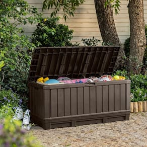 Uma incrível solução de armazenamento de ótima qualidade que também se converte em assento para dois adultos. O baú de armazenamento Kentwood lhe oferece um acabamento com aparência de madeira que complementa qualquer decoração externa. Tem capacidade total de 350L em seu interior, medindo 59 cm de altura, 53.6 cm de largura e 128 cm de comprimento, para você armazenar todos os tipos de objetos. O Baú Kentowood é uma solução ideal para manter o seu quintal organizado e arrumado, com muito espaço para coisas como almofadas de cadeiras, jogos ao ar livre e ferramentas de jardinagem. Fácil de montar, não requer o uso de ferramentas especiais, é feito de material de resina durável, resistente às intempéries e livre de manutenção por anos de uso.