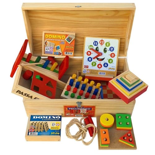 Baú de madeira com dobradiças e fecho, medindo 50x32x25xcm. Acompanha 10 brinquedos: dominó de formas geométricas, jogo de pinos, prancha de seleção, relógio, bate pinos, passa figuras, dominó tradicional, cubos de encaixe, pula corda e palavras cruzadas. Obs.: sobra espaço para colocar mais brinquedos. CE-BRI/ICEPEX - N 00928-96