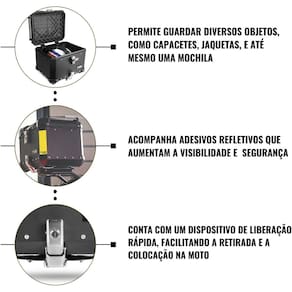 Seu dispositivo de liberação rápida transforma a pilotagem permitindo que, em segundos, você retire ou fixe o baú, enquanto os adesivos refletivos aumentam a visibilidade e segurança nas estradas.