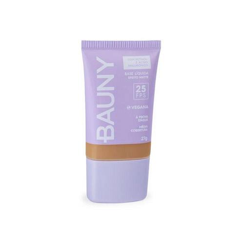 Base líquida com média cobertura e acabamento matte. Bauny Cosméticos Matte FPS 25 deixa a pele uniformizada, macia e firme.