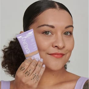 Limpe a pele, hidrate e, caso prefira, utilize o primer da Bauny que possui efeito “soft focus”, com disfarce óptico de linhas de expressão. Utilize a base da Bauny na sequência, construindo sempre a cobertura de sua preferência.