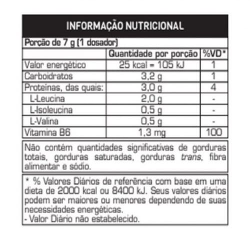 O extraordina´rio 4:1:1 bcaa drink e´ uma fo´rmula da max titanium. composto por aminoa´cidos de cadeia ramificada, ele conte´m 100% da *idr de vitamina b6 por dose. ale´m de oferecer alta concentrac¸a~o de aminoa´cidos essenciais na proporc¸a~o de 4:1:1 entre leucina, isoleucina e valina, o 4:1:1 bcaa drink e´ conhecido por ser extremamente saboroso em suas quatro verso~es!. aumento de energia manutenção muscular bca amino modo de preparomisturar 7g (1 dosador) em 200ml (1 copo) de a´gua gelada.sugesta~o de usoconsumir diariamente ou conforme orientac¸a~o de me´dico ou nutricionista.lactosena~o conte´m.ale´rgicospode conter derivados de leite, ovo e soja.ingredientes: maltodextrina, l-leucina, l-isoleucina, l-valina, piridoxina (vitamina b6), acidulantes ácido málico e ácido cítrico, regulador de acidez citrato de sódio, edulcorante sucralose e corante artificial roxo vinho. não contém glúten.