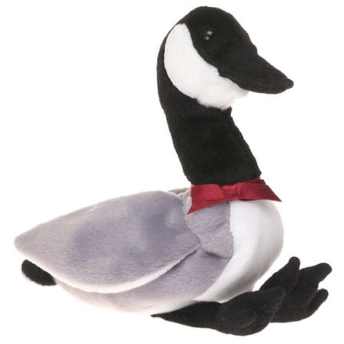 Este Beanie Baby mostra uma atenção incrível aos detalhes. Suas marcas são ótimas: ela tem pés pretos, cabeça e penas da cauda; branco na parte inferior e sob as asas, bochechas e cauda; e cinza em seu corpo e asas. Ao redor de seu pescoço há um arco de cetim marrom. Olhos de botão preto completam esta fabulosa ave. Muito colecionável, Loosy também faz um grande presente. Apenas lavagem de superfícies. --Peggy Etra