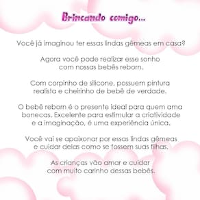 Estamos muito felizes em apresentar as Boneca Bebê Reborn Gêmeas para você, um produto cuidadosamente selecionado para atender às suas necessidades.