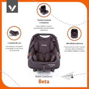 O Bebê Conforto Beta da Voyage tem estrutura leve, que facilita o transporte e a instalação no veículo. Item essencial para a segurança do seu filho, desde a saída da maternidade e em todos os passeios do bebê. Alça com 4 posições: Modos fixos, balanço, carregar e instalar no carro ou no carrinho. Com a alça ajustável para modo fixo ou balanço, é possível utilizar o Beta como uma cadeira de descanso, em casa, para deixar o bebê sempre próximo ou distraí-lo com o modo balanço. Conta ainda com almofadas redutoras super macias e acolchoadas para melhor adaptação dos recém-nascidos. Os tecidos são macios para manter o conforto do bebê mesmo em viagens longas e a capota é removível, para uso em ambientes internos. O Beta tem cinto de segurança de 3 pontos, com protetores de ombros acolchoados e que podem ser ajustados em 2 posições de altura com ajuste centralizado da largura. A praticidade que os pais tanto precisam na limpeza é garantida pela capa lavável na máquina.