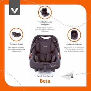 Características: 5 Modos de uso: Pode ser utilizado de forma fixa, como balanço, para transporte, além de ser compatível para instalação no carrinho e no automóvel. Almofada redutora acolchoada: Ideal para proporcionar conforto ao recém-nascido, garantindo um encaixe seguro. Cinto de segurança de 3 pontos: Ajustável em 2 posições de altura, com ajuste de largura centralizado e protetores de ombros acolchoados. Capota removível: Pode ser retirada para uso em ambientes internos ou em dias mais frescos. Tecido lavável à máquina: Capa e redutor removíveis para facilitar a limpeza. Compatível com carrinhos Voyage: Verificar a compatibilidade no manual do carrinho antes da compra. Estrutura leve e resistente: Facilita a instalação e o transporte do bebê conforto.