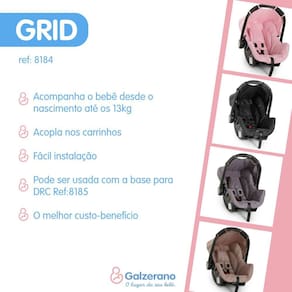 O bebê Conforto (dispositivo de retenção) Grid, da Galzerano, foi projetado para as crianças do grupo 0+: de 0 até 13kg, possui cinto de segurança de 3 pontos com protetores de ombro garantindo tranquilidade aos pais. Conta ainda com capota, acolchoado do encosto e assento removíveis e tecido removível para lavagem.- Compatível com a base de acoplamento de bebê conforto para automóveis (drc) Galzerano 8185 (vendida separadamente)- Dispositivo de retenção para crianças do grupo 0+: de 0 a 13 Kg- Cinto de segurança de 3 pontos com protetores de ombro- Capota removível- Estrutura em plástico resistente com base arredondada para balançar- Acolchoado do encosto e do assento removível com sistema dupla face- Tecido removível e lavável- Prático para transportar o bebê- Alça anatômica, para mais conforto ao carregar- Acompanha adaptadores- Estrutura em plástico injetado de alta resistência com base arredondada para balançarDimensões e Peso:- Largura: 43 cm- Altura: 55 cm- Comprimento: 64 cm- Peso: 2,2kg Conteúdo da embalagem: - 01 Bebê Conforto Grid Preto, Modelo: 8184BL, com adaptadores- Manual de instruçõesEste produto Produto é certificado NBR 14400;Este produto Produto é certificado pelo INMETRO Nº 010288/2022 | OCP 0040 - SGS