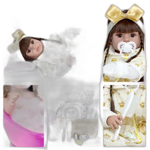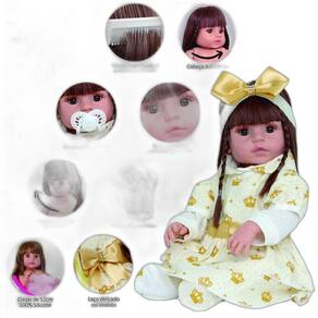 A nossa empresa tem a missão de garantir a total satisfação de seus clientes, onde a qualidade e o atendimento excepcional são nossa prioridade Estamos muito felizes em apresentar a Boneca Bebê Reborn para você, um item cuidadosamente selecionado para atender às suas necessidades. Compre agora e experimente a diferença em comprar com a nossa empresa. A Boneca Bebê Reborn é o sonho das meninas Produzida 100% em vinil siliconado, essa boneca pode sentar, deitar e fazer tudo que a sua imaginação deixar. Com seus olhos castanhos e cabelos implantados ela é encantadora e apaixonante. Sua criança merece a melhor qualidade de bebê reborn Marca: Cegonha Reborn Dolls Modelo: Boneca Bebê Reborn Cor: Bege Material: Vinil Siliconado Atóxico Características principais: Membros Articulados, Corpo de Silicone, Detalhes Realistas. Medidas Aprox.: Altura da Boneca: 52cm Peso Aprox. Da Boneca: 0,745 Kg Certificado INMETRO Recomendado para crianças maiores de 03 anos Conteúdo: 01 Bebê Reborn Cabeça, Membros e Corpo de Vinil 01 Conjunto Macacão e Vestido 01 Mamadeira 01 Escova de Cabelo 01 Pente 01 Chupeta Magnética 01 Certidão de Nascimento 01 Manual de Cuidados 01 Certidão de Vacinas 01 Exame do Pézinho 01 Prendedor de Chupeta 01 Kit com 3 Fraldas 01 Bolsa Maternidade 01 Laço de Cetim 30 dias de oferecida pelo fabricante. Dúvidas Frequentes: 1. O Cabelo é implantado mesmo ou peruca R. O cabelo da boneca Bailarina é totalmente implantado. 2. Ela emite algum som R. Não, ela não emite nenhum som. 3. Pode dar banho na boneca R. Sim, pois o material do corpo é de Silicone. 4. O cabelo pode ser penteado R. Sim, o cabelo da boneca pode ser suavemente escovado e penteado. Tags: boneca, bebe, reborn, realista, menina, infantil, silicone, princesa, linda, fofa, banho , enxoval, completo, presente, grande, baby alive.