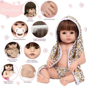 A nossa empresa tem a missão de garantir a total satisfação de seus clientes, onde a qualidade e o atendimento excepcional são nossa prioridade Estamos muito felizes em apresentar a Boneca Bebê Reborn para você, um item cuidadosamente selecionado para atender às suas necessidades. Compre agora e experimente a diferença em comprar com a nossa loja. A Boneca Bebê Reborn é o sonho das crianças Produzida 100% em vinil siliconado, essa boneca pode sentar, deitar e fazer tudo que a sua imaginação deixar. Com seus olhos castanhos e detalhes realistas ela é encantadora e apaixonante. Sua criança merece a melhor qualidade de bebê reborn Marca: Cegonha Reborn Dolls Modelo: Boneca Bebê Reborn Cor: Bege Material: Vinil Siliconado Atóxico Características Principais: Membros Articulados, Corpo de Silicone, Detalhes Realistas. Medidas Aprox.: Altura da Boneca: 46cm Peso Aprox. Da Boneca: 0,745 Kg Certificado INMETRO Recomendado para crianças maiores de 03 anos Conteúdo: 1 Bebê Reborn Cabeça, Membros e Corpo de Vinil 1 Saída de Banho Girafa 1 Par de Cílios 1 Par de Brinco 1 Chupeta 1 Mamadeira Simples 5 Certificados 3 Fraldas 1 Laço Cetim 2 Presilhinha 1 Par de Luvas 1 Bolsa Maternidade 1 Prendedor de Chupeta Kit Pente e Escova Simples 1 Pelúcia cor 30 dias de oferecida pelo fabricante. Dúvidas Frequentes: 1. Ela acompanha Itens R. Sim, todos os itens da descrição. 2. Ela emite algum som R. Não, ela não emite nenhum som. 3. Pode dar banho na boneca R. Sim, pois o material do corpo é de Silicone. 4. Pode escolher a cor dos olhos da boneca R. Não, os olhos já vêm de fábrica. Tags: Realista, Menina, Infantil, Silicone, Princesa, Linda, Morena, Loira, Fofa, Banho, Enxoval, Completo, Grande. Homologação Inmetro: IP-BRI-0099/2022-06