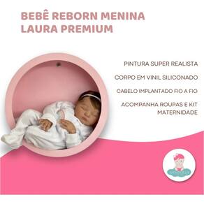 50 cm e aprox. 2 kg (tamanho e peso de recém-nascido) Corpo em Vinil Siliconado, macio e Pode Tomar Banho Pintura à mão com veias, unhas e detalhes úmidos Olhos Fechados com cílios naturais Cabelo implantado fio a fio