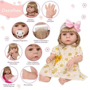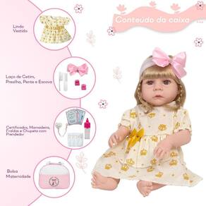 Conteúdo: 1 Bebê Reborn Cabeça, Membros e Corpo de Vinil 1 Vestido 1 Par de Cílios 1 Par de Brincos 1 Chupeta 1 Mamadeira Simples 5 Certificados 3 Fraldas 1 Laço Cetim 2 Presilhinha 1 Par de Luvas 1 Bolsa Maternidade 1 Prendedor de Chupeta Kit Pente e Escova Simples