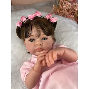 Nossos bebês são confeccionados com o mais alto padrão de qualidade em vinil siliconado e tecido macio. Os olhos castanhos brilhantes garantem uma aparência encantadora e realista.