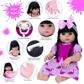 A Boneca Bebê Reborn é o sonho das meninas Produzida 100% em vinil siliconado, essa boneca pode sentar, deitar e fazer tudo que a sua imaginação deixar. Com seus olhos castanhos e detalhes realistas ela é encantadora e apaixonante. Sua criança merece a melhor qualidade de bebê reborn
