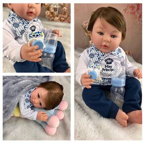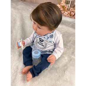 Nossos bebês são confeccionados com o mais alto padrão de qualidade em vinil siliconado e tecido macio. Os olhos azuis brilhantes garantem uma aparência encantadora e realista.