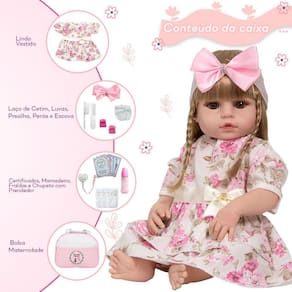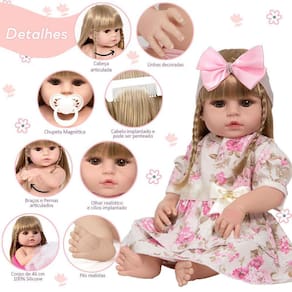 A Boneca Bebê Reborn é o sonho das crianças Produzida 100% em vinil siliconado, essa boneca pode sentar, deitar e fazer tudo que a sua imaginação deixar. Com seus olhos castanhos e detalhes realistas ela é encantadora e apaixonante. Sua criança merece a melhor qualidade de bebê reborn