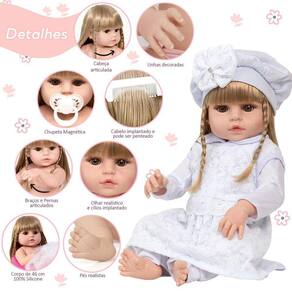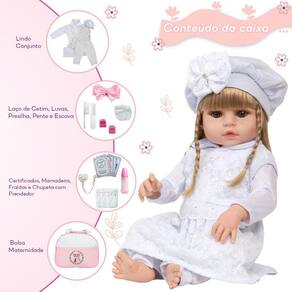 A Boneca Bebê Reborn é o sonho das crianças Produzida 100% em vinil siliconado, essa boneca pode sentar, deitar e fazer tudo que a sua imaginação deixar. Com seus olhos castanhos e detalhes realistas ela é encantadora e apaixonante. Sua criança merece a melhor qualidade de bebê reborn