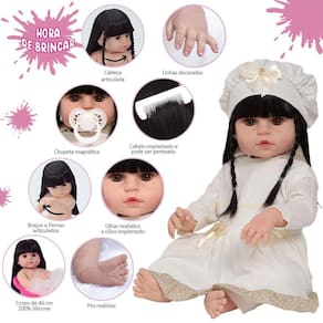 A nossa empresa tem a missão de garantir a total satisfação de seus clientes, onde a qualidade e o atendimento excepcional são nossa prioridade Estamos muito felizes em apresentar a Boneca Bebê Reborn para você, um item cuidadosamente selecionado para atender às suas necessidades. Compre agora e experimente a diferença em comprar com a nossa loja.A Boneca Bebê Reborn é o sonho das meninas Produzida 100% em vinil siliconado, essa boneca pode sentar, deitar e fazer tudo que a sua imaginação deixar. Com seus olhos castanhos e detalhes realistas ela é encantadora e apaixonante. Sua criança merece a melhor qualidade de bebê reborn Marca: Cegonha Reborn DollsModelo: Boneca Bebê Reborn Cor: BegeMaterial: Vinil Siliconado AtóxicoCaracterísticas Principais: Membros Articulados, Corpo de Silicone, Detalhes Realistas.Medidas Aprox.: Altura da Boneca: 46cm Peso Aprox. Da Boneca: 0,745 Kg Certificado INMETRO Recomendado para crianças maiores de 03 anosConteúdo:1 Bebê Reborn Cabeça, Membros e Corpo de Vinil 1 Conjunto de Roupa Luxo1 Par de Cílios1 Par de Brinco1 Chupeta 1 Mamadeira Simples5 Certificados3 Fraldas1 Laço Cetim2 Presilhinha1 Par de Luvas1 Bolsa Maternidade1 Prendedor de ChupetaKit Pente e Escova SimplesGarantia30 dias de garantia oferecida pelo fabricante.Dúvidas Frequentes:1. Ela acompanha ItensR. Sim, todos os itens da descrição.2. Ela emite algum somR. Não, ela não emite nenhum som.3. Pode dar banho na bonecaR. Sim, pois o material do corpo é de Silicone.4. Pode escolher a cor dos olhos da bonecaR. Não, os olhos já vêm de fábrica.Tags: Realista, Menina, Infantil, Silicone, Princesa, Linda, Morena, Loira, Fofa, Banho, Enxoval, Completo, Grande, Baby Alive.Homologação Inmetro: IP-BRI-0099/2022-06