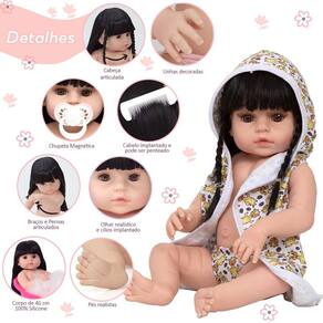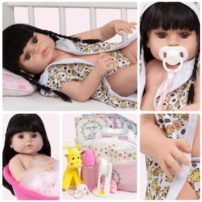 A nossa empresa tem a missão de garantir a total satisfação de seus clientes, onde a qualidade e o atendimento excepcional são nossa prioridade Estamos muito felizes em apresentar a Boneca Bebê Reborn para você, um item cuidadosamente selecionado para atender às suas necessidades. Compre agora e experimente a diferença em comprar com a nossa loja. A Boneca Bebê Reborn é o sonho das crianças Produzida 100% em vinil siliconado, essa boneca pode sentar, deitar e fazer tudo que a sua imaginação deixar. Com seus olhos castanhos e detalhes realistas ela é encantadora e apaixonante. Sua criança merece a melhor qualidade de bebê reborn Marca: Cegonha Reborn Dolls Modelo: Boneca Bebê Reborn Cor: Bege Material: Vinil Siliconado Atóxico Características Principais: Membros Articulados, Corpo de Silicone, Detalhes Realistas. Medidas Aprox.: Altura da Boneca: 46cm Peso Aprox. Da Boneca: 0,745 Kg Certificado INMETRO Recomendado para crianças maiores de 03 anos Conteúdo: 1 Bebê Reborn Cabeça, Membros e Corpo de Vinil 1 Saída de Banho Girafa 1 Par de Cílios 1 Par de Brinco 1 Chupeta 1 Mamadeira Simples 5 Certificados 3 Fraldas 1 Laço Cetim 2 Presilhinha 1 Par de Luvas 1 Bolsa Maternidade 1 Prendedor de Chupeta Kit Pente e Escova Simples 1 Pelúcia cor 30 dias de oferecida pelo fabricante. Dúvidas Frequentes: 1. Ela acompanha Itens R. Sim, todos os itens da descrição. 2. Ela emite algum som R. Não, ela não emite nenhum som. 3. Pode dar banho na boneca R. Sim, pois o material do corpo é de Silicone. 4. Pode escolher a cor dos olhos da boneca R. Não, os olhos já vêm de fábrica. Tags: Realista, Menina, Infantil, Silicone, Princesa, Linda, Morena, Loira, Fofa, Banho, Enxoval, Completo, Grande. Homologação Inmetro: IP-BRI-0099/2022-06