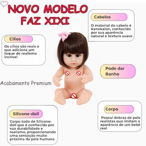 Nós da Sweetie Reborn Brasil ® apresentamos a nossa adorável Boneca Bebê Reborn, agora com a incrível funcionalidade de fazer xixi! Confeccionada em vinil com acabamento de Silicone-doll, proporciona um toque único e sem cheiro. Ela possui 38 cm e 670 gramas, sendo perfeita para crianças a partir de 3 anos. Totalmente segura e certificada pelo INMETRO 002 552/2022, 100% aprovada nos ensaios físicos/mecânicos, químicos e livre de Ftalato!