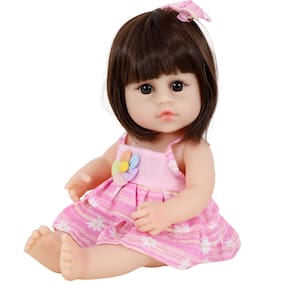 Seu cabelo de Kanekalon é costurado à mão, muito macio, lavável e tão realista que parece de verdade. Seus olhos acrílicos de alta qualidade têm uma cor castanha encantadora, embora não se fechem ou pisquem. Este conjunto inclui um vestido, calcinha, presilha de cabelo e meia.