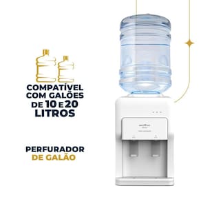 Temperatura da água: Natural 16°C e Gelada 6° a 12°C 2 saídas de água Tipo de gás: R600a Resfriamento por compressor Bandeja coletora removível Luz indicadora de funcionamento e água gelada Capacidade de refrigeração: 1,1 Litros por hora Capacidade do reservatório interno: 0,8 Litro Potência: 160W (127V) e 110W (220V) Tensão/Hz: 127V (60Hz) e 220V (60Hz) Comporta garrafões de até 20L.